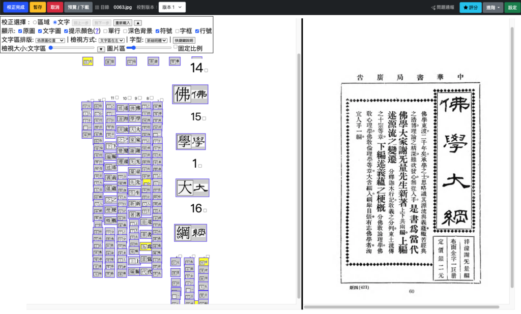 「中研院文字辨識與校對平台」是由中研院數位文化中心運用影像處理與深度學習技術研發,在中文古籍與複雜版面處理上具備領先能力,包括: