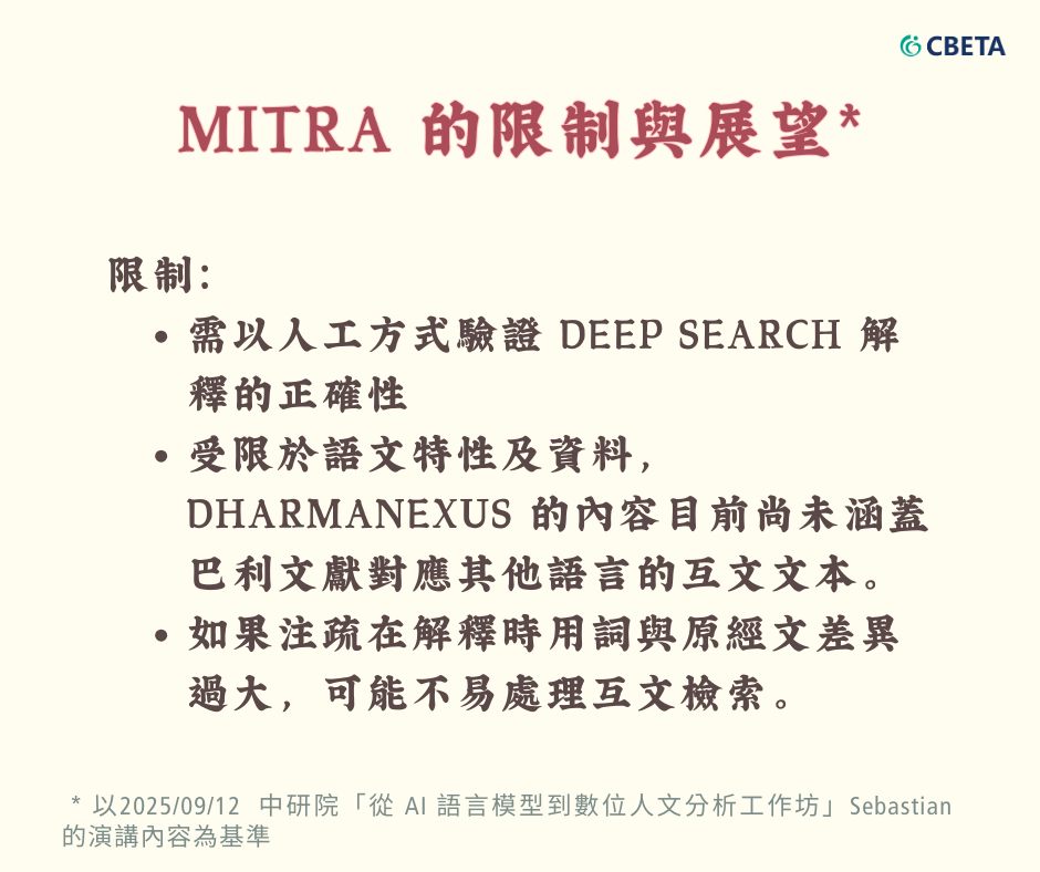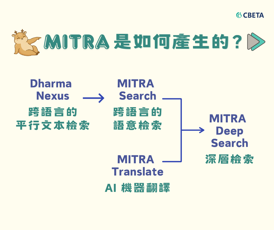 - Mitra Deep Search:主要是機器翻譯功能,並結合 MitraSearch 檢索結果,產生深度互動。